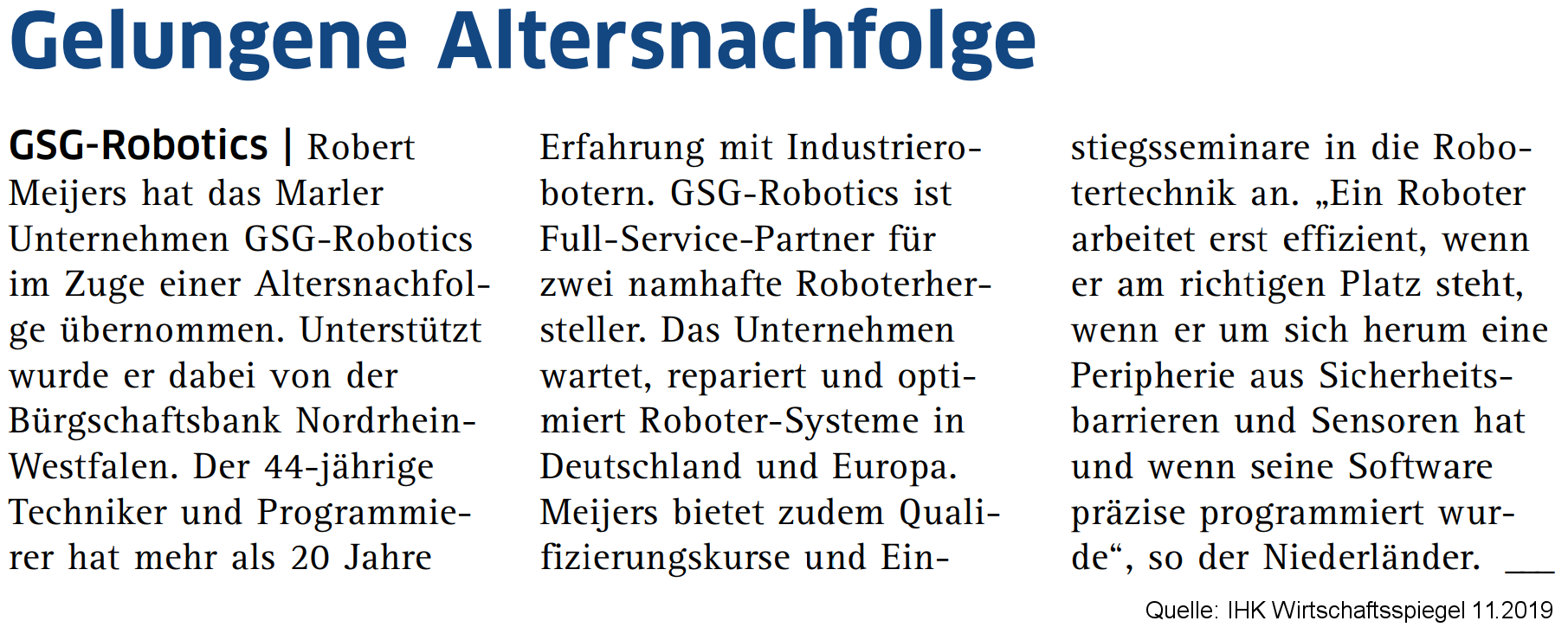 In der Ausgabe November 2019 des Wirtschaftsspiegels hat die IHK Nordwestfalen einen Artikel über Roger Meijers (dort versehentlich Robert Meijers), Geschäftsführer der GSG Robotics in Marl, veröffentlicht.
